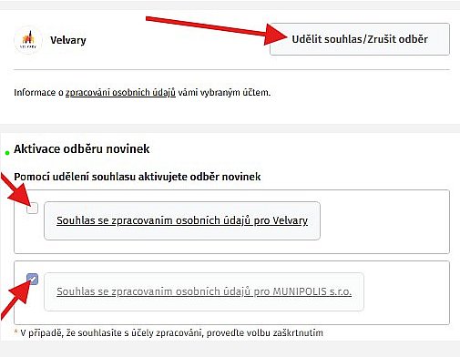 Stačí kliknout a udělit souhlas u města Velvary a na následující stránce zatrhnout Souhlas se zpracováním osobních údajů. Současně si můžete své údaje zkontrolovat a doplnit, abyste mohli dostávat cílené aktuální informace a důležité zprávy.